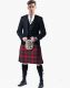 This kilt has some classic design features as well as some modern touches. The coat is plain black with the cuffs and side pocket flaps decorated with silver metal squares. On the shoulders are also some shoulder straps with silver buttons. The outfit comes with a plain white collar shirt and a black tie. The kilt uses a dark blue and a Celtic green to create a checkered pattern. This medium-length kilt is made with high-quality materials and has a plain front and a pleated rear side. The outfit comes with a leather sporran which is tied around the waist using a silver chain.