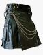 Fashion Leather Kilt With Chains is considered a symbol of modern fashion that also offers functional features. It is versatile and ideal for Wedding functions, Casual parties, and Family get-togethers. It has utility features of dual cargo pockets for storing your gadgets. These pockets are decorated with eyelets and a small leather strap. On the front waist, four buttons are used to fasten and make the kilt fit. Black Gothic Leather Kilt has a simple plain apron with three button straps on both sides that adjust the front apron. Each strap is connected with an O-ring. Silver chains are hanging on the front apron, which is associated with the help of side lobster clasps. On the front bottom side, rivet buttons are studded for an attractive look, while the pleated pattern also gives ease in walking and performing other activities. Belt loops are attached with a side D-ring for hanging chains and keys. We also provide the customize option on sizes and colors, which is perfect for your wardrobe.