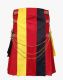 Germany Flag Gothic Kilt has functionality and a patriotic kilt that matches your taste and personality. It comes with a detachable apron to add more twist to the flag's gothic design. German Flag Kilt has a front apron with three color combinations: yellow, red, and black. Front apron designs show the German flag sign, giving a simple look. It has a pleated pattern on the back for a traditional appearance and ease of movement. It has three plastic buckles with red nylon straps to fix the front apron on both sides. Each nylon strap is connected with a plastic buckle. To give it a stylish look, it has chains that are hanging with the help of lobster clasps on both sides, which offers a contemporary look. This German Flag Utility Kilt has large pockets to store your essentials. These flap pockets are decorated with snap buttons for securing your items quickly. All the hardware material used in this kilt is rust-free and long-lasting. The D-ring is attached with black loops for hanging keys and chains. It also has red nylon straps around the back and sides for bold and appealing details.