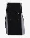 Grey and Black Two Tone Utility Hybrid Kilt is a unique piece of clothing offering comfort, styling, and a different look. It has a simple flat front apron with stud decoration, giving the kilt an eye-catching look. It has snap buttons on the waistline for a perfect fit. It has stylish belt loops that enhance the kilt's beauty, and D-rings are attached to each loop for external attachments. You can hang pockets, keys, and other lightweight items with the help of D-rings. It has detachable pockets, providing ample space for everyday essentials. Grey and Black Hybrid kilt has a flap button to keep your items safe. These pockets are detachable; you can also remove them according to your choice. One extra small black pocket on a grey pocket for making contrast and making the kilt attractive. On the side of the kilt, black straps with eyelets are used to adjust the kilt through the side buckle. This kilt is handcrafted and available in various fabric color options so that you can select your favorite color by choice.