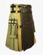 Khaki with Brown Leather Gothic Hybrid Kilt is specially designed for those looking for a unique and stylish kilt to show their personality with a royal look. It also adds a touch of elegance to your outfits, setting you apart from the crowd at any event. This kilt is designed with a brown leather detachable apron in which three nylon button straps are sewn on both sides of the apron for a gothic look. At the same time, traditional khaki pleated designs are stitched on either side for freedom and comfortable movement on all occasions. Khaki Gothic Hybrid Kilt is styled with snap buttons on the top front waist of the apron for kilt fastening and making an accurate fit. O-rings are attached with side nylon straps that show a classy look. It is handmade, and we offer a customization option so that you will get a new kilt according to your requirements. Large pockets are styled on both sides, with one flap of brown leather and one in khaki cotton. These pockets offer enough storage to carry your belongings. Khaki with Brown Leather Gothic Hybrid Kilt is manufactured with 100% pure cotton and leather fabric, which makes it comfortable for long-day use. We offer it at the cheapest price to make it accessible for every budget. Whether heading a Scottish wedding event or a Casual party, this kilt will make you distinctive from others. Order it now and get this custom handmade kilt to your doorstep on time.