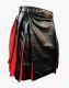 Modern Black and Red Leather Kilt is a versatile and classy design that attracts viewers with its unique look and distinctive appearance. Its stitching style is great and designed to cater to current fashion needs. It is the perfect option to wear on your wedding events, casual functions or daily use. This kilt is a simple, plain black apron, attractive and charming. In contrast, red pleats are sewn on either side for tradition and used for easy movement at different events. Leather Loops are attached with snap buttons on the wrist to hold and wear the belt quickly to make the waist accurately fit. Modern Black and Red Leather Kilt has fastening buttons on the top front waist for securing the kilt. These buttons make a unique fashion design in this kilt. You have the best option to choose the colour combination of leather. Modern Black and Red leather kilt is fabricated with top-quality cow leather fabric that is durable and easy to wear. We aim to deliver a great quality product in your desired size. So place your order now and get this modern leather kilt at an excellent price.