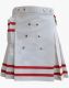 Women's White Utility Mini Kilt with Red Straps offers a bold and expressive look to show your personality in a modern way. It comes with hardware decoration that makes it more attractive and stylish. This Kilt is perfect for those women who want some functionality and attractiveness in their Kilt. The front apron of the Kilt is beautiful and decorated with studs for a charming look. The pleats are stitched on either side for comfortable movement on casual and formal occasions. Women White Utility Mini Kilt has two red stripes sewn throughout the bottom for an attractive look and a great combination with the Kilt. It has a fastening button on the front waist for kilt closure. It comes with a small pocket with a red strap on the right side to store items safely with a snap button. Two silver chains are hung with red straps on the back side of the Kilt for a stylish and modern look. We offer customization options on size and colors, so you will get a kilt that matches your style and specifications.
